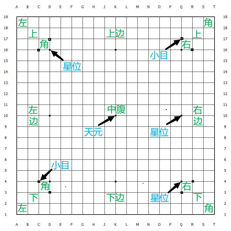 用區(qū)域、星位和位置高低的表述便于分析和討論棋局。除區(qū)域外,在分析和討論棋局時(shí),棋盤上一個(gè)交叉點(diǎn)的位置通常有兩種表述方式:分析討論局部時(shí),用與較近兩條邊線的距離表述該點(diǎn)的位置(如四角的星位因處于從較近邊線的第四條線位置,稱為44;天元從四條邊線數(shù)都是第十個(gè)交叉點(diǎn),就是1010);在分析全局時(shí),會(huì)用到棋盤圖案旁邊的字母A—T和數(shù)字1—19,如用D16表示左上角的星位、D4表示左下角的星位,用K10表示天元等??拷慕切俏唬?/font>34)有八個(gè)位置被稱為小目(本圖中用小方點(diǎn)標(biāo)注),